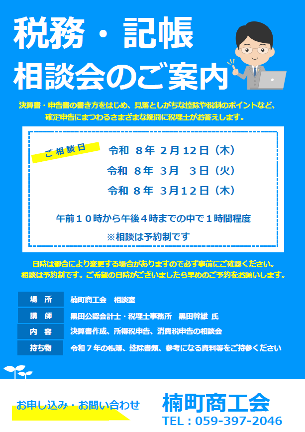 令和7年分の確定申告期となり、商工会では、事業者の確定申告にまつわる様々な疑問を解決するための個別相談会を開催いたします。